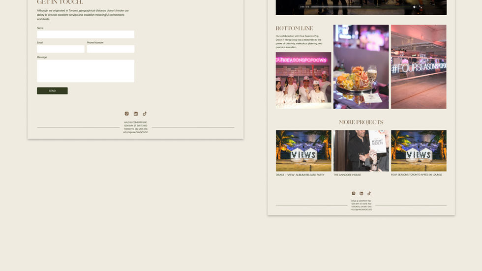 The first website design project I worked on was for Halo & Co., a Toronto-based PR company specializing in lifestyle and luxury hospitality brands. By incorporating the agency's logo, colour palette, and tone of voice, I created a cohesive brand identity throughout the site. I prioritized a seamless user experience with easy navigation and clear calls to action, ensuring visitors could quickly access information.